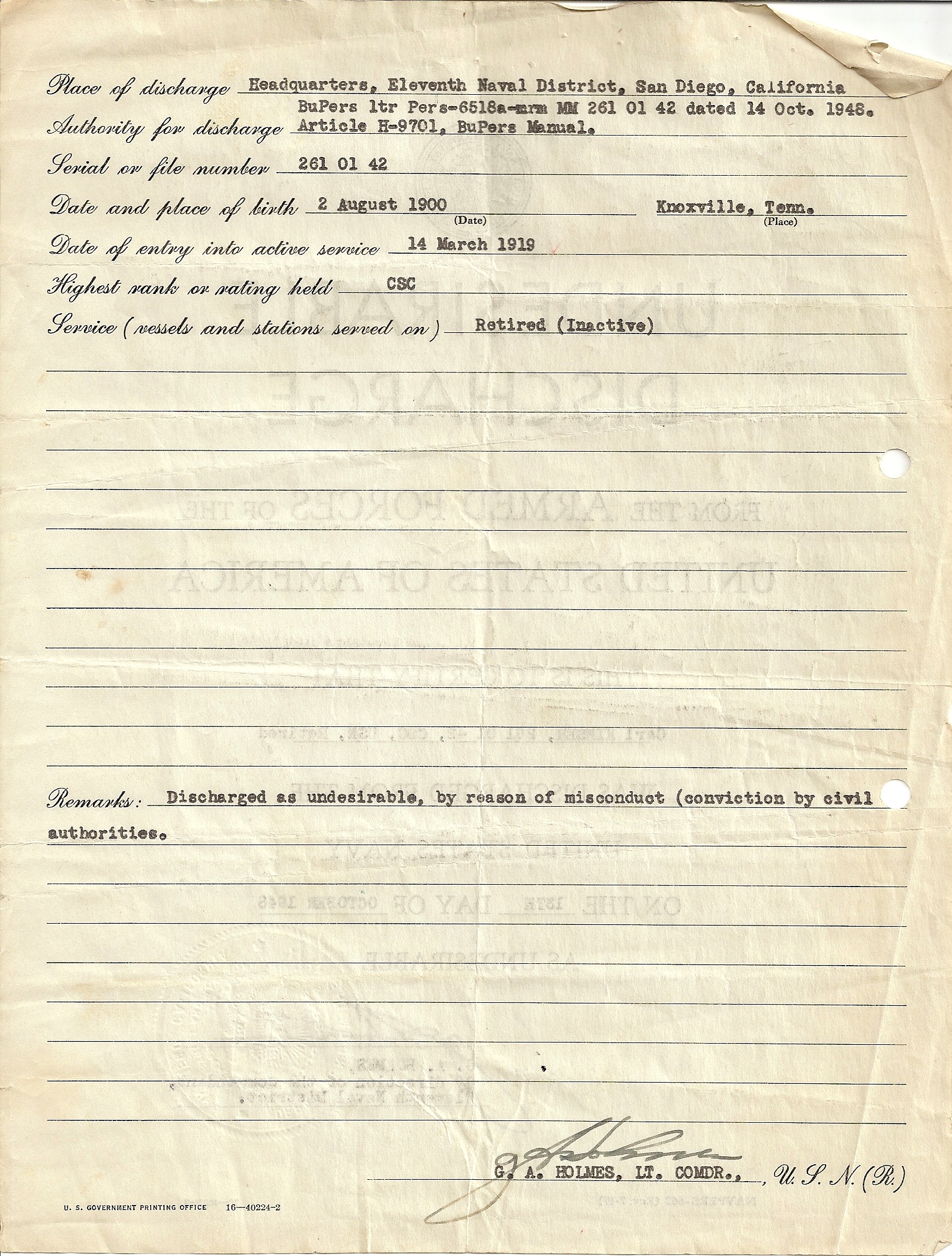 Carl was born 2 Aug 1900 in Knoxville, Tennessee. His family moved between Tennessee and South Carolina to farm and work in cotton mills. He joined the US Navy when he was 18 and was in active duty until May 1941 and left Pearl Harbor 7 months before the bombing. He was a Recruiter, Bugler and Chief Commisary Steward. He received an Undesirable Discharge from the US Navy on 13 Oct 1948 because of conviction by civil authorities. As an adult he was 5' 8 1/2" tall, 158 lbs., blue eyes and light brown hair. He married Helen Maurice Heard abt. 1927. They had 2 children and were divorced (?).. At the end of his life he lived at 431 1/2 E. Broadway, Long Beach, CA, and was a dishwasher at the Crown Cafeteria Restaurant. He died 28 Nov 1965 of Arteriosclerotic Cardiovascular Disease and was cremated at Forest Lawn Crematory in Cypress, CA.