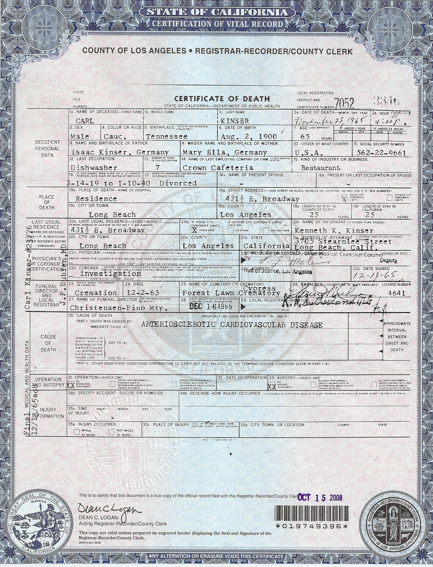 Carl was born 2 Aug 1900 in Knoxville, Tennessee. His family moved between Tennessee and South Carolina to farm and work in cotton mills. He joined the US Navy when he was 18 and was in active duty until May 1941 and left Pearl Harbor 7 months before the bombing. He was a Recruiter, Bugler and Chief Commisary Steward. He received an Undesirable Discharge from the US Navy on 13 Oct 1948 because of conviction by civil authorities. As an adult he was 5' 8 1/2" tall, 158 lbs., blue eyes and light brown hair. He married Helen Maurice Heard abt. 1927. They had 2 children and were divorced (?).. At the end of his life he lived at 431 1/2 E. Broadway, Long Beach, CA, and was a dishwasher at the Crown Cafeteria Restaurant. He died 28 Nov 1965 of Arteriosclerotic Cardiovascular Disease and was cremated at Forest Lawn Crematory in Cypress, CA.