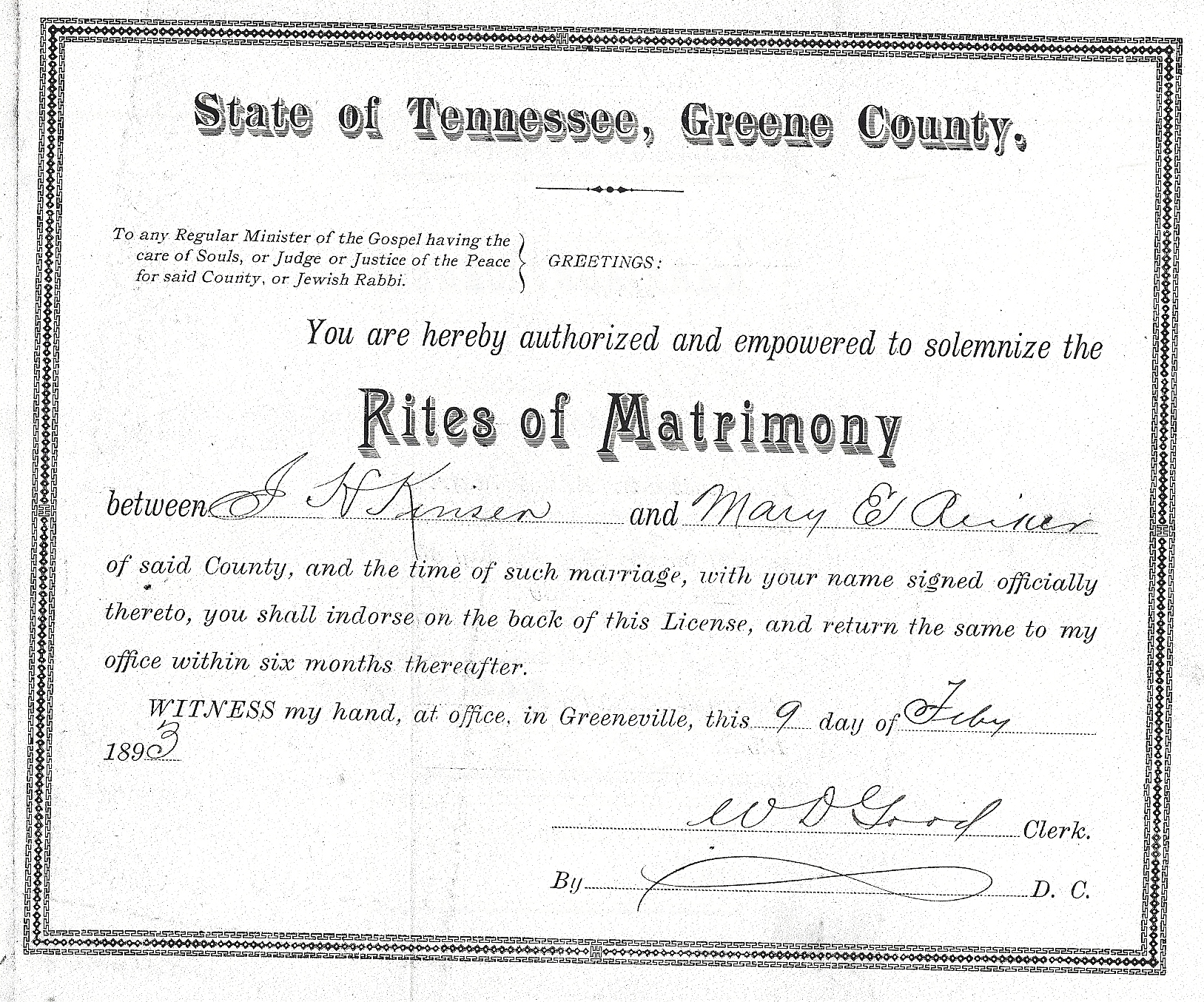 1893 Marriage Certificate (Mary Ellen Ricker)
